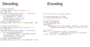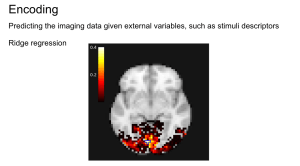 In the experiment of Miyawaki et al. (2008) several series of 10×10 binary images are presented to two subjects while activity on the visual cortex is recorded. The visual reconstruction steps are shown to the left. In the original paper, the training set is composed of random images (where black and white pixels are balanced) while the testing set is composed of structured images containing geometric shapes (square, cross…) and letters. Here, for the sake of simplicity, we consider only the training set and use cross-validation to obtain scores on unseen data. In the following example, we study the relation between stimuli pixels and brain voxels in both directions: the reconstruction of the visual stimuli from fMRI, which is a decoding task, and the prediction of fMRI data from descriptors of the visual stimuli, which is an encoding task.