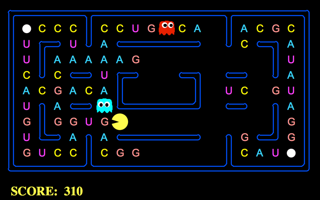 The DNA Pac-Man game (https://github.com/HussainAther/dnapacman) can represent how protein sequences are generated (using Hidden Markov Models). We can draw an analogy of how HMMs work in the context of generating protein sequences using the Pac-Man. The next token/letter you eat is the next letter in the sequence of generating a sequence of protein amino acids.