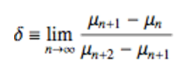 | We can graph μ and x, which are two numbers that multiply to give a fixed value. By looking at different μ values that are close to one another, we can calculate δ, the Feigenbaum constant. |