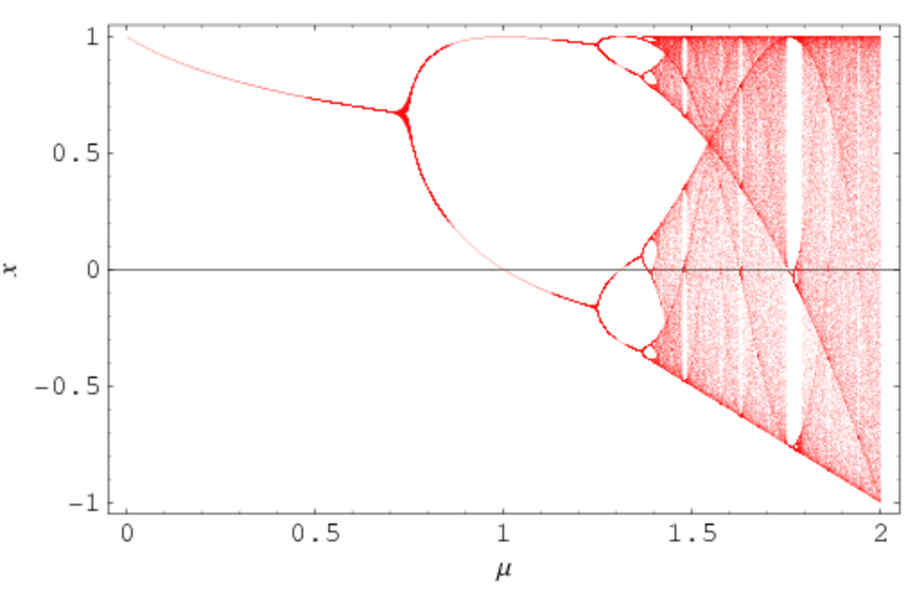 | We can graph μ and x, which are two numbers that multiply to give a fixed value. By looking at different μ values that are close to one another, we can calculate δ, the Feigenbaum constant. |